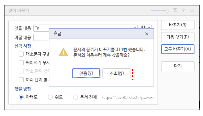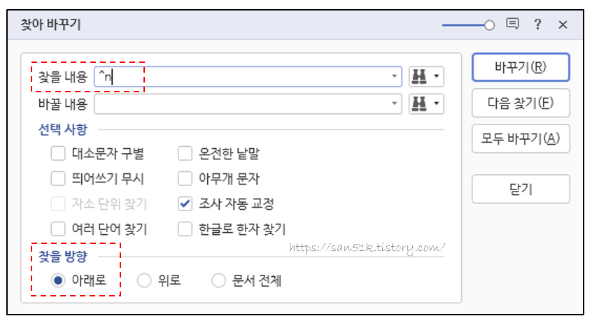 4. 찾을 내용 : ^n / 바꿀 내용 : 공백 / 찾을 방향 : 아래로 → 모두 바꾸기