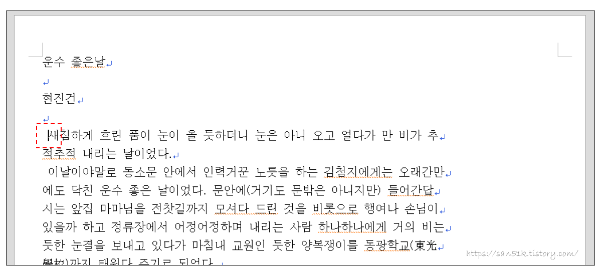 - 첨부한 문서는 기간이 만료된 저작물로 현진건의 운수좋은날입니다. 상단의 저작자명과 저작물명을 제외한 나머지 엔터부호를 제거하고자 합니다.